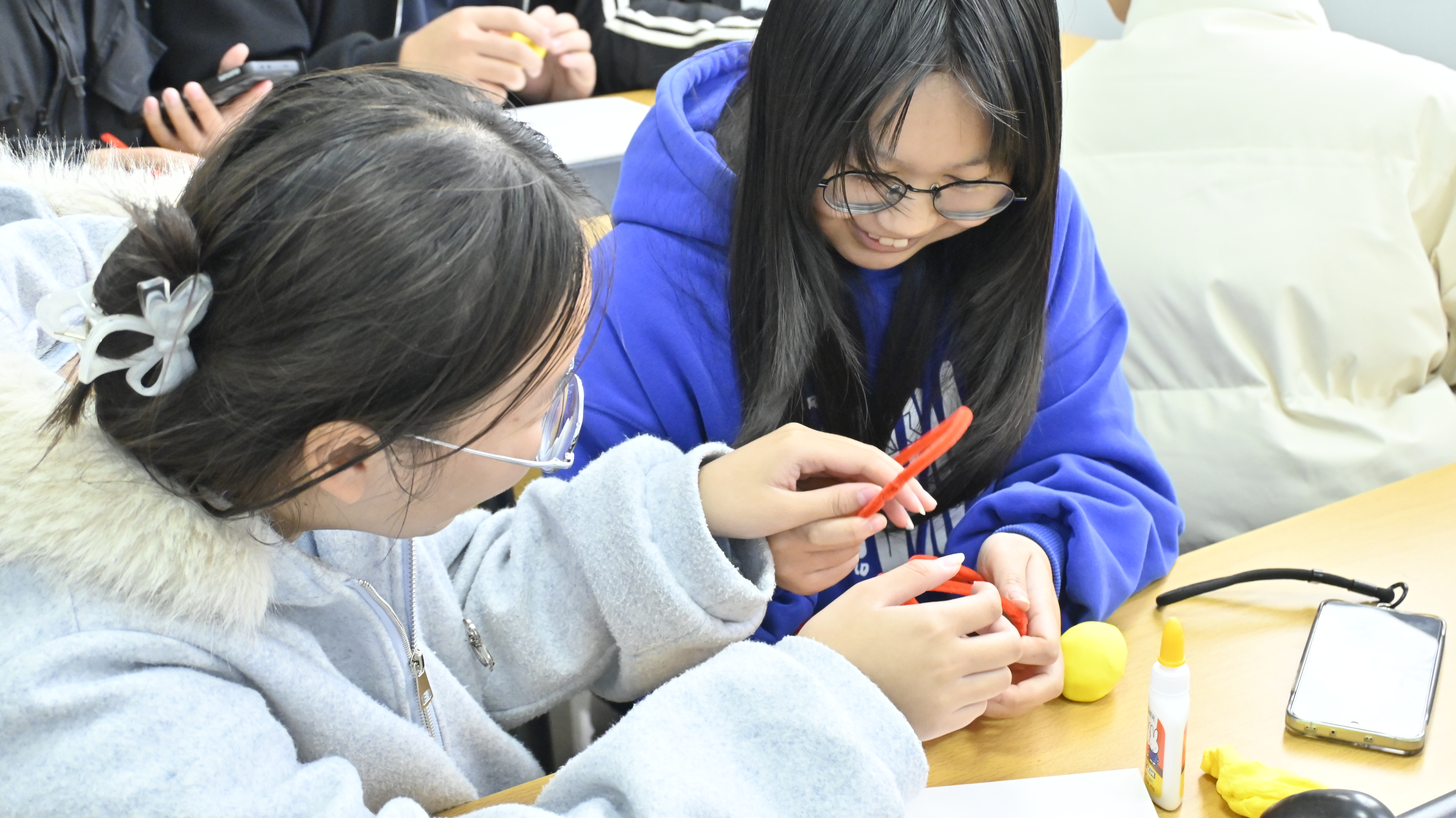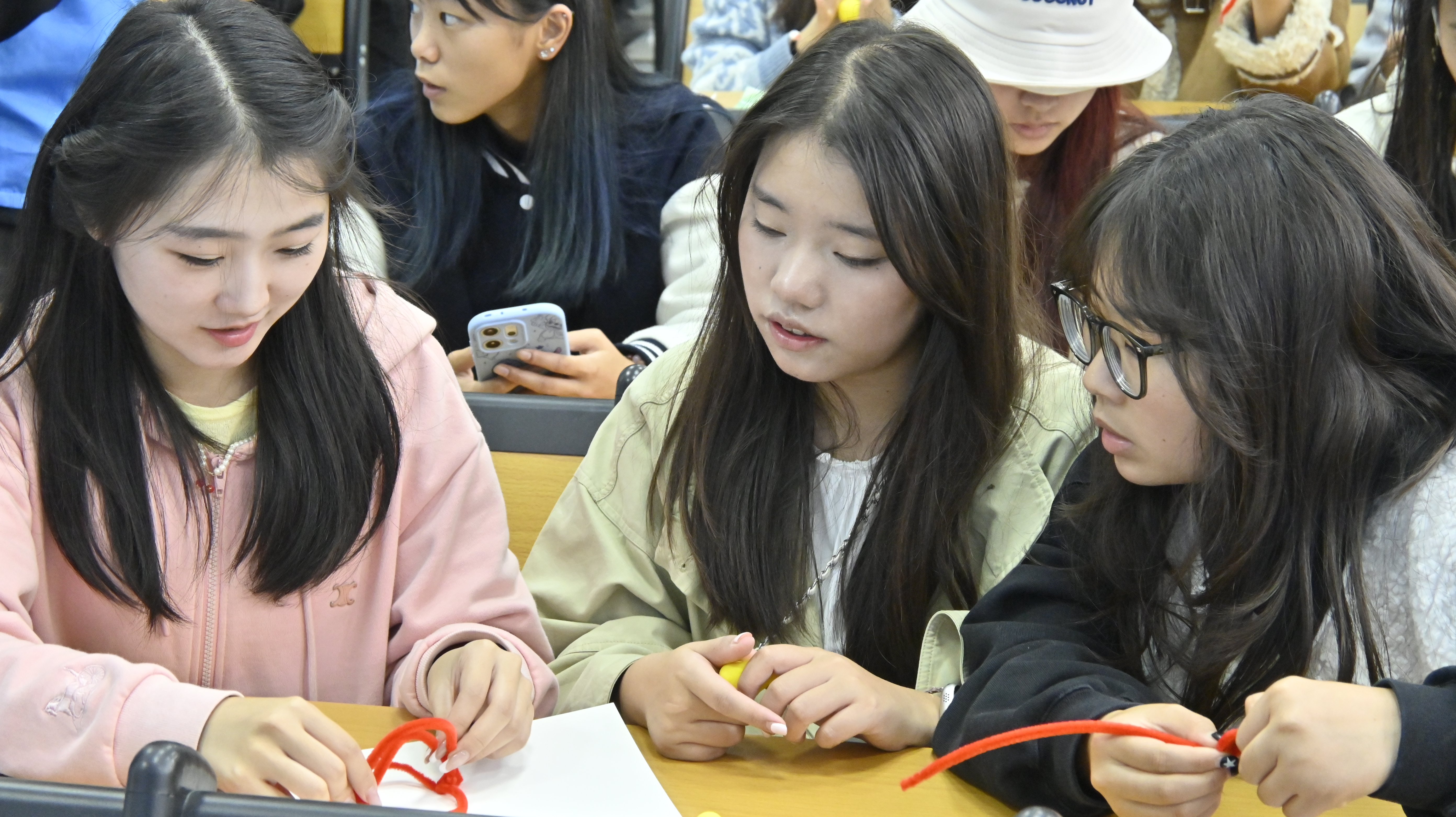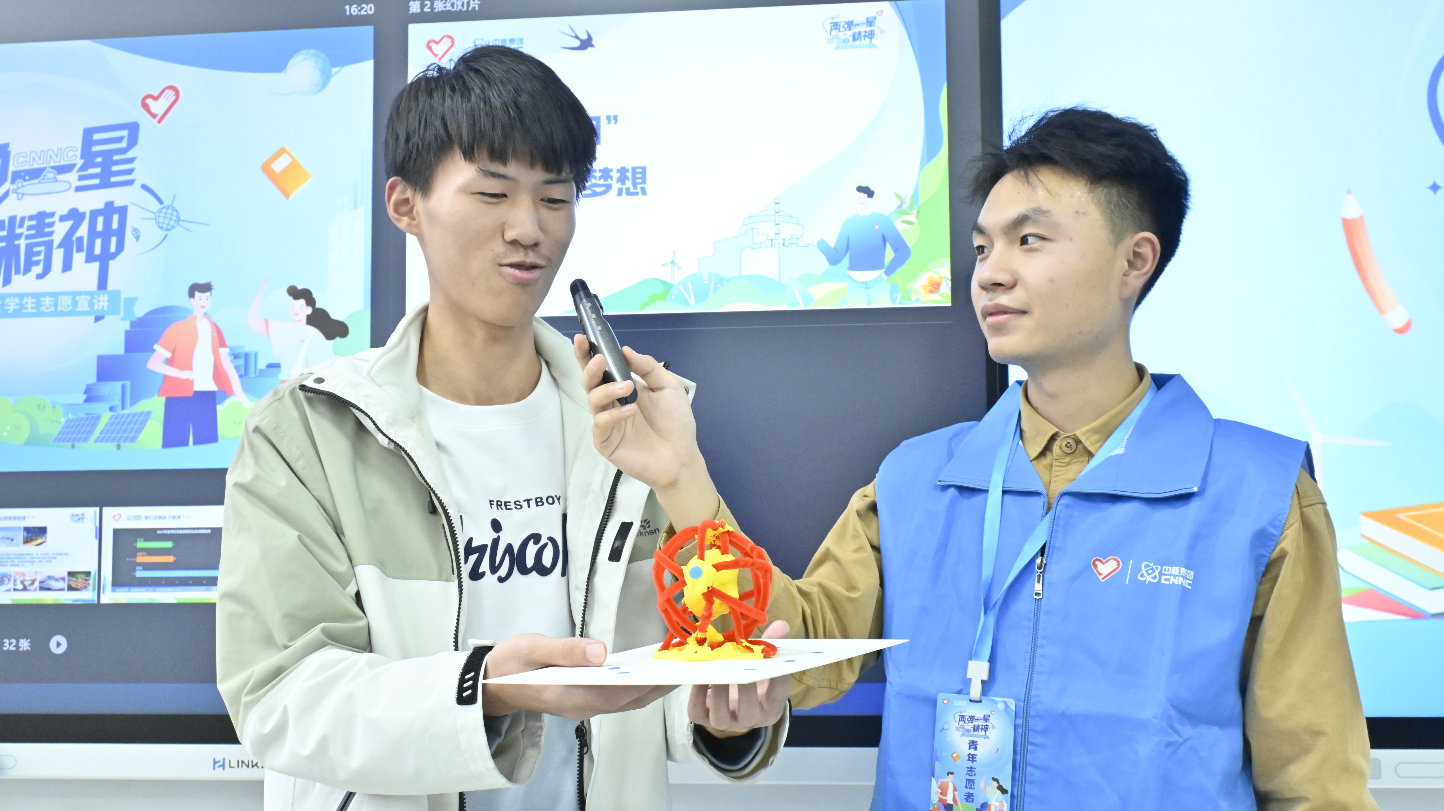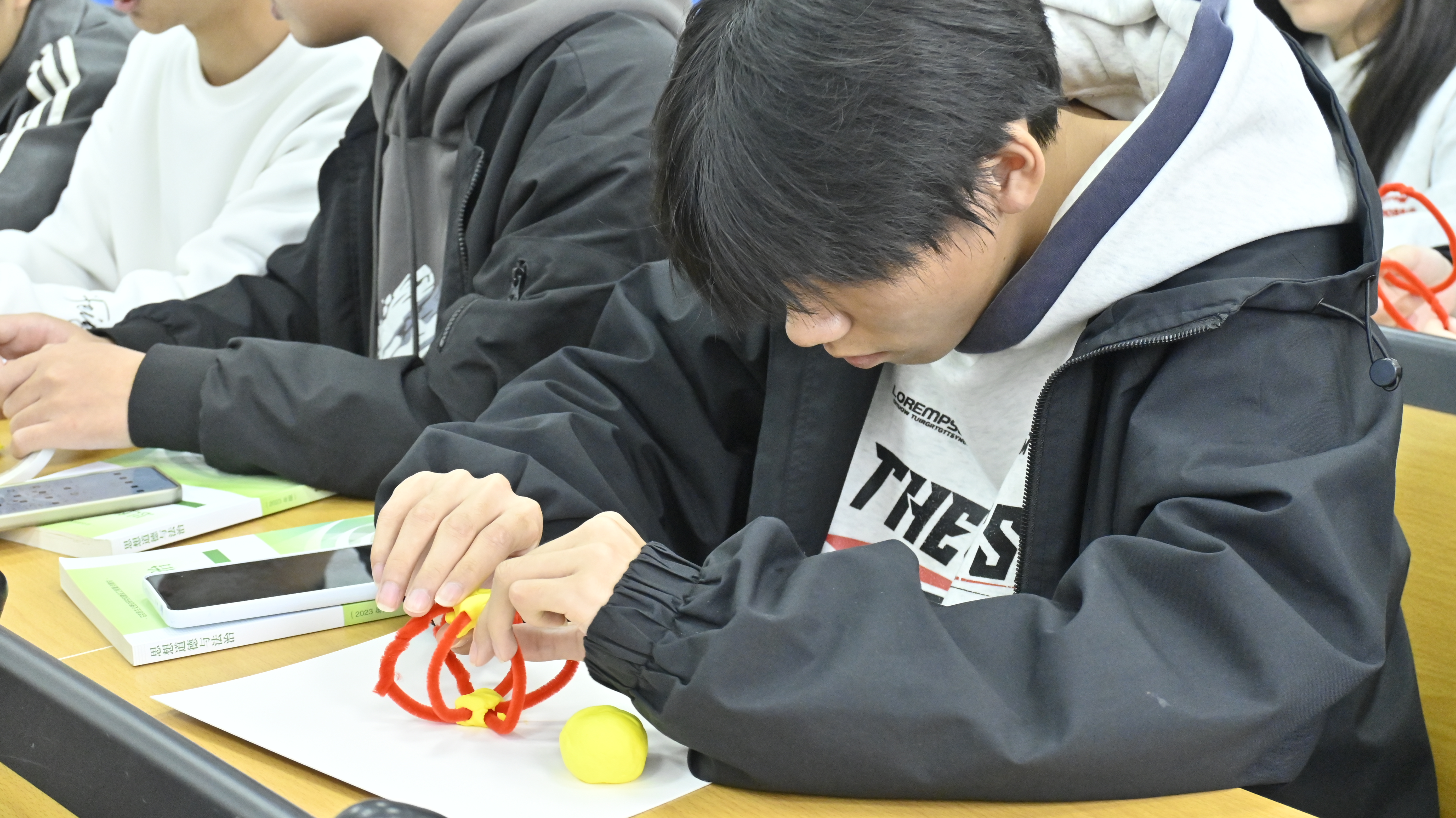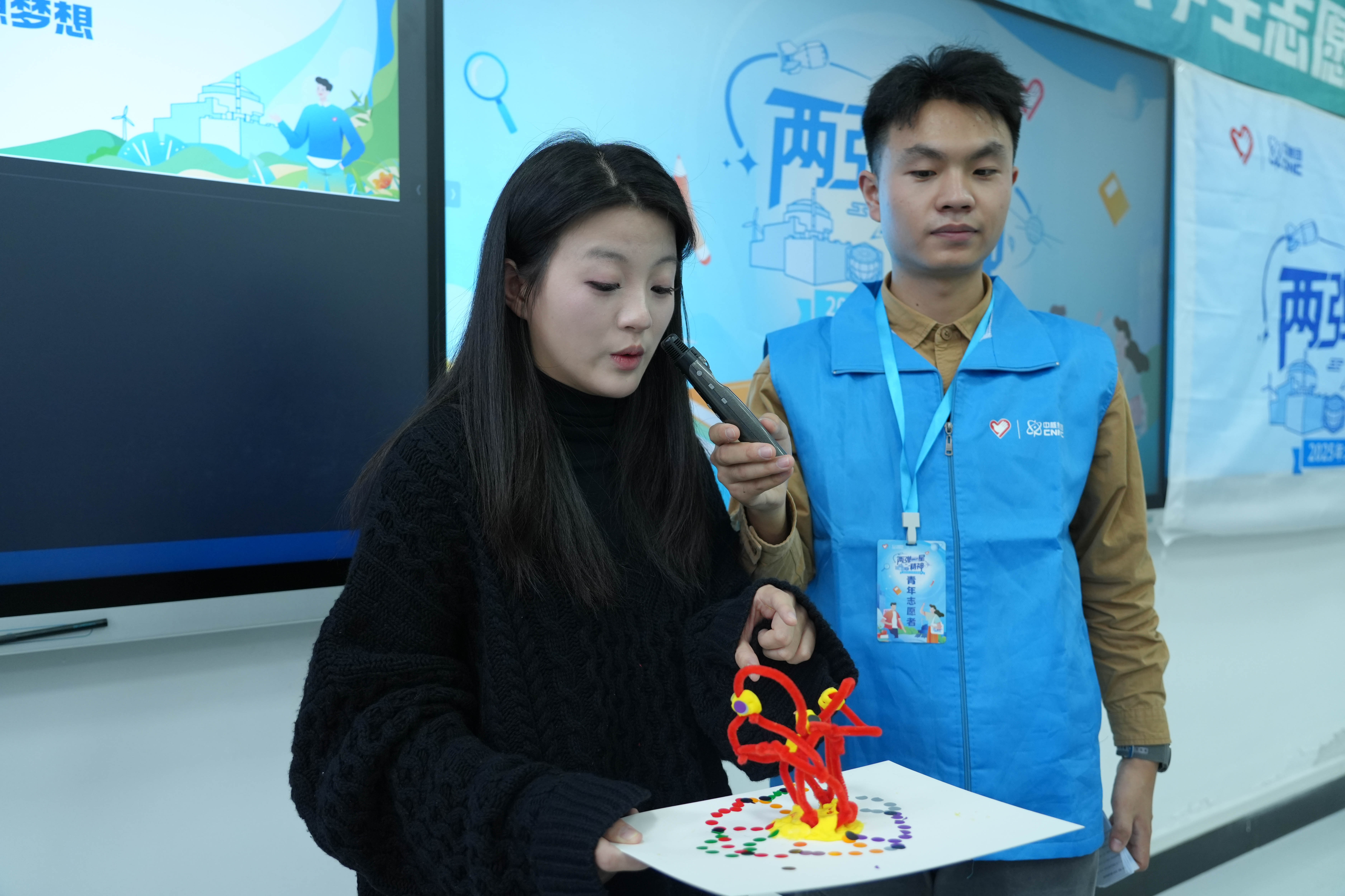 理论学习点燃实践热情。在随后的“巧手造太阳”手工环节中,现场气氛达到高潮。宣讲团为同学们分发了五颜六色的扭扭棒和手工黏土,鼓励大家亲手制作心中的“人造太阳”。同学们或凝神构思创作蓝图,或分组协作热烈讨论,灵巧的双手将扭扭棒塑造成形态各异的环形装置,一个个独具匠心的“人造太阳”模型在指尖诞生,抽象的科学概念化为可触可感的艺术成果。“大力协同、勇于登攀”的“两弹一星”精神,在欢声笑语与团队协作中得到生动诠释。
